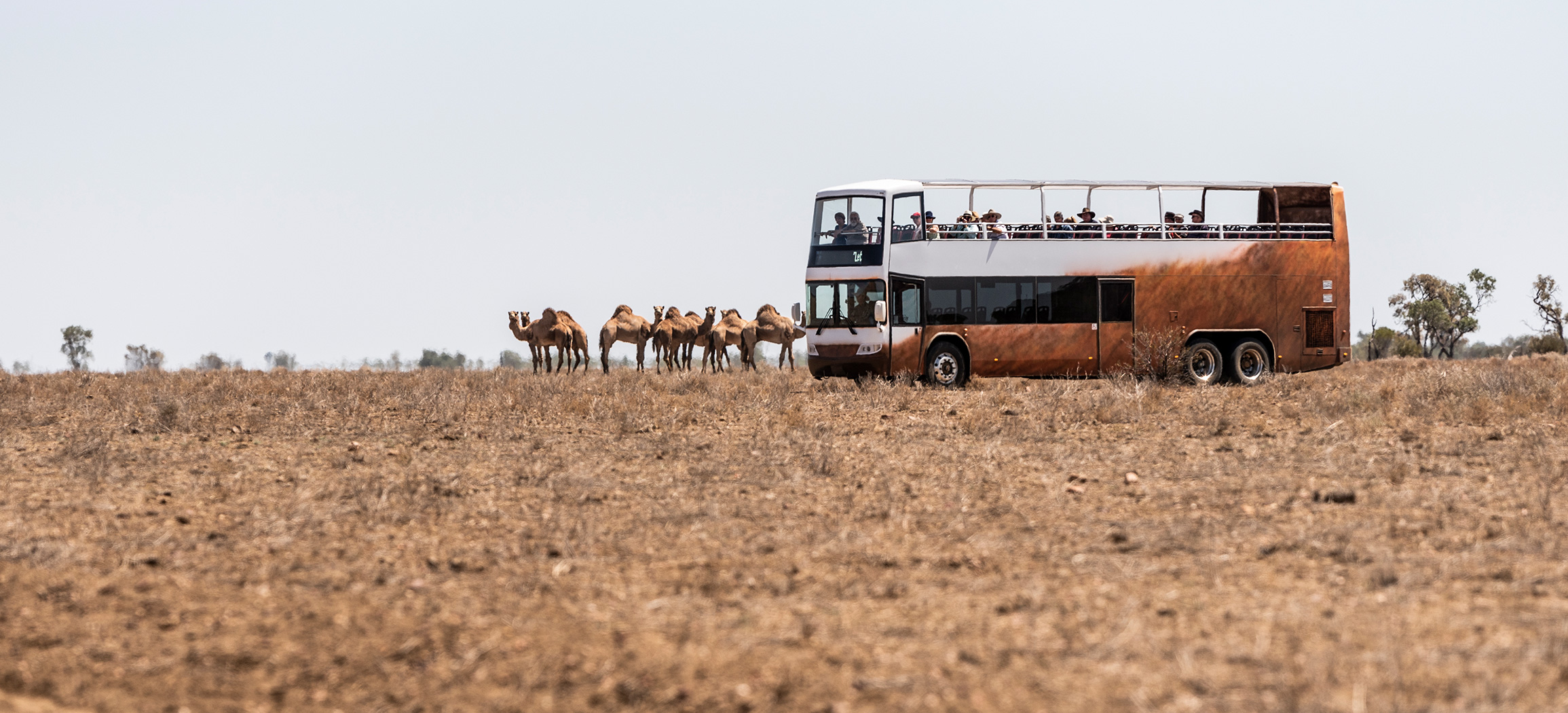 Visitors hop aboard a double-decker, open-top bus that has been designed to handle the rough terrain of the station.